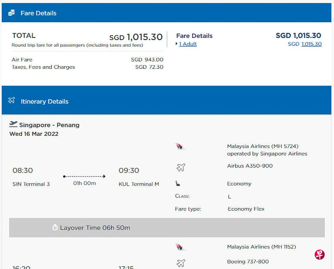 从槟城返回新加坡则只有一趟VTL航班,单程要价501.40。因此,搭乘首趟VTL航班的新加坡—槟城往返价格要高达1015.30元。对比相同行程的非VTL航班则为656.30元,价格高出近一倍。