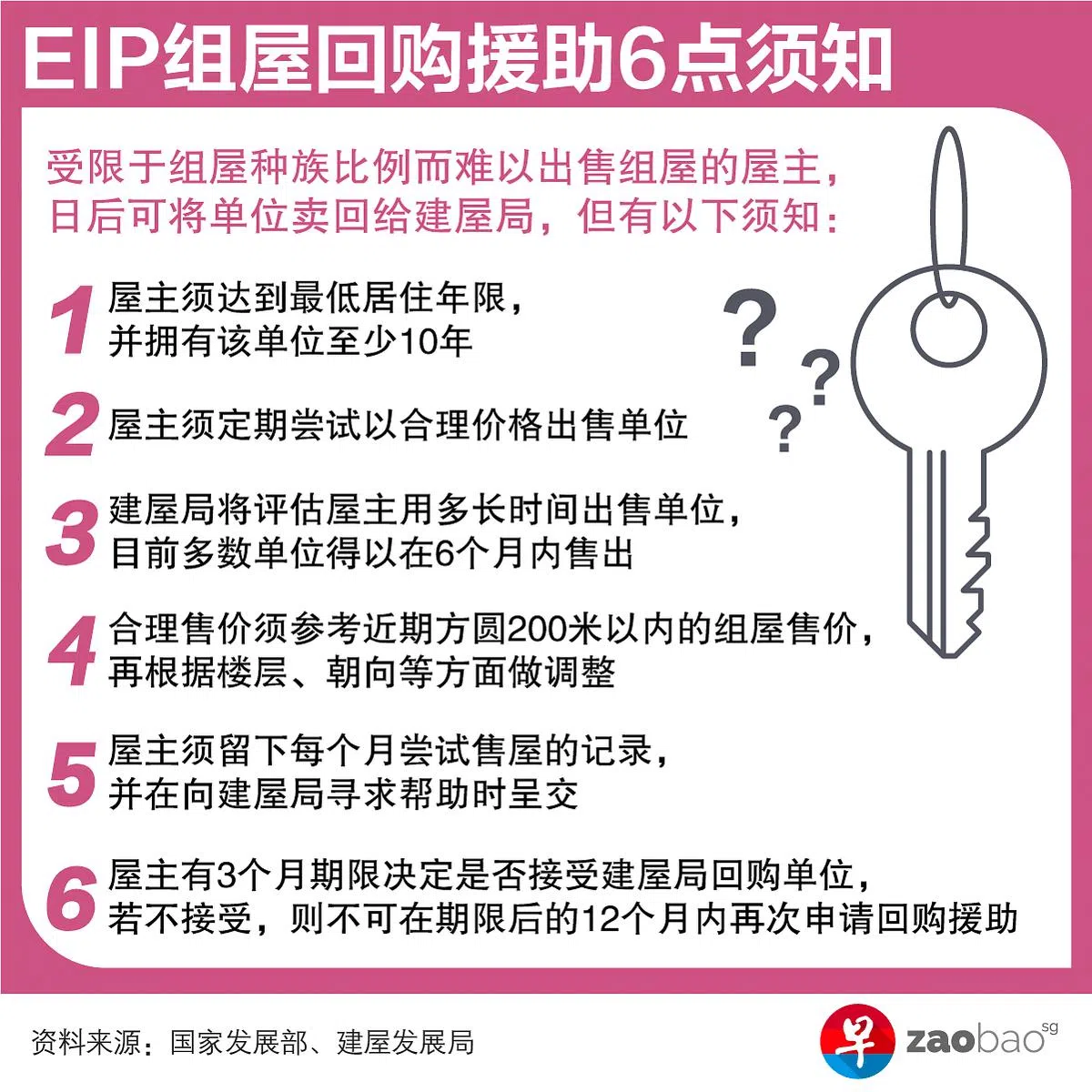 只要是受EIP影响的屋主,不论单位当初是向建屋局购买或在转售市场购买,也不论买屋时是否已受种族比例限制,都可申请EIP组屋回购援助。援助也不限组屋地点,摩天组屋达士岭或其他黄金地段组屋的屋主也可申请援助,建屋局不为回购价设上限。