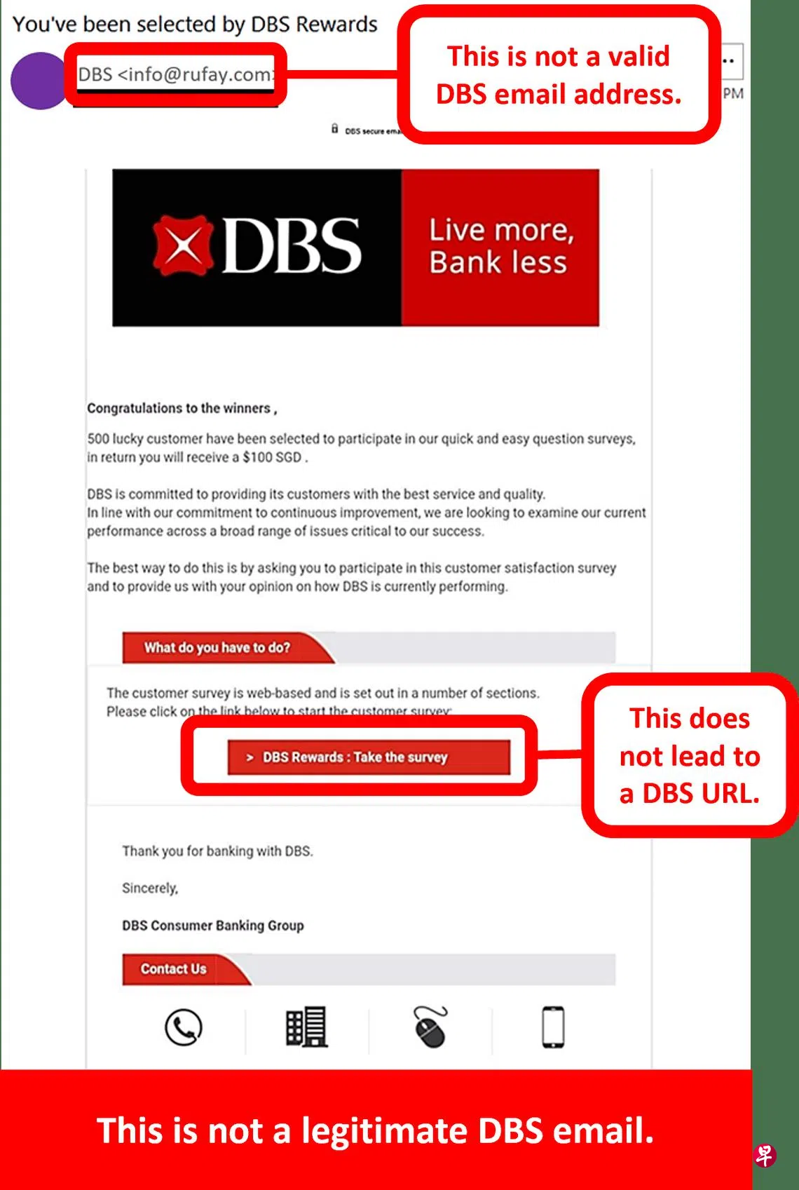 星展银行留意到诈骗电邮后,今天(3月8日)在官方网站上发布消息提醒客户说,近来出现不少冒充银行发出的网络钓鱼邮件,邮件内容声称完成问卷调查的500名客户,将会获得现金回馈或者航空里程数作为奖励。
