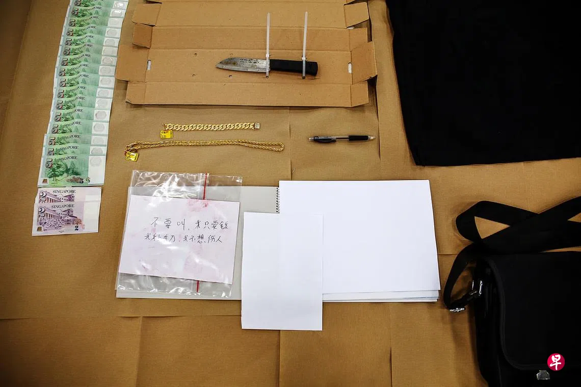 被告过后递纸条给女店员,上面写着“不要叫,我只要钱。我身上有刀,我不想伤人。”接着亮刀威胁要钱,吓得对方直尖叫,跑往柜台后方的办公室。