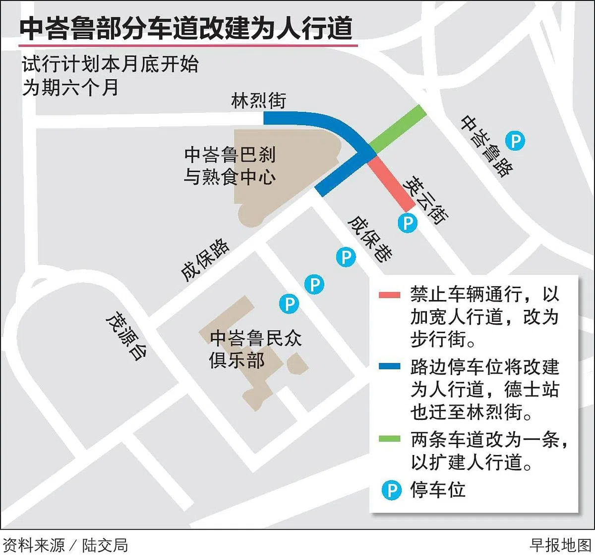 (早报讯)中峇鲁巴刹与熟食中心一带的部分路边停车位将在本月底改成人行道,其中一条路段也将禁止车辆通行,以打造更宽敞的步行和绿色社区空间。