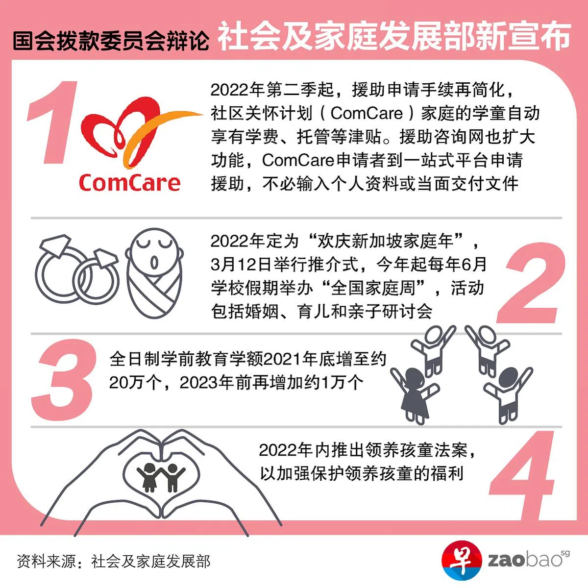 (早报讯)社会及家庭发展部将2022年定为“欢庆新加坡家庭年”,强调家庭对每个人和国家的重要性。公众将可参与一系列活动,包括家庭植树活动、全国家庭周等。