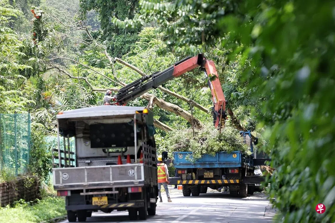 记者抵达现场时,警方已封锁受影响道路的出入口,禁止民众通行。事发不久后,当局派工人前去锯树,之后再将轿车拖走,交通才恢复通畅。