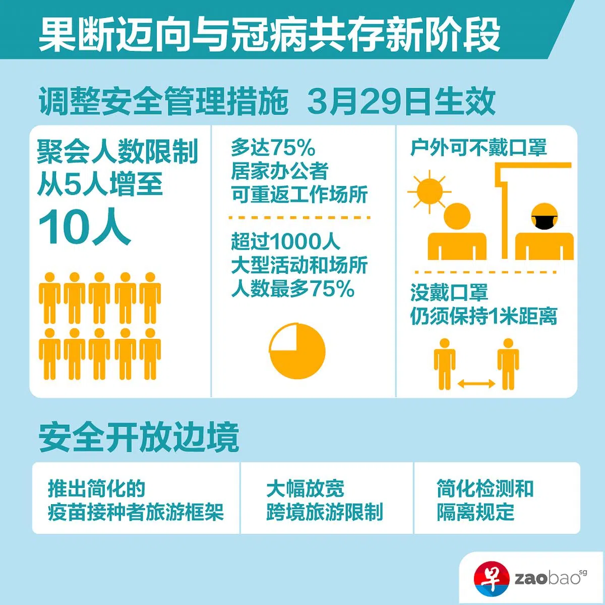 (早报讯)下周二(3月29日)起,社交聚会人数限制将从目前的五人放宽至10人,人们在户外也可选择不戴口罩,但室内仍须戴口罩。