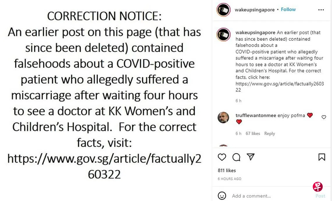 (早报讯)在社交媒体发表有关一名孕妇在竹脚妇幼医院等候四小时后流产的不实贴文,自称“替代新闻来源”的网站Wake Up Singapore接获更正指示。