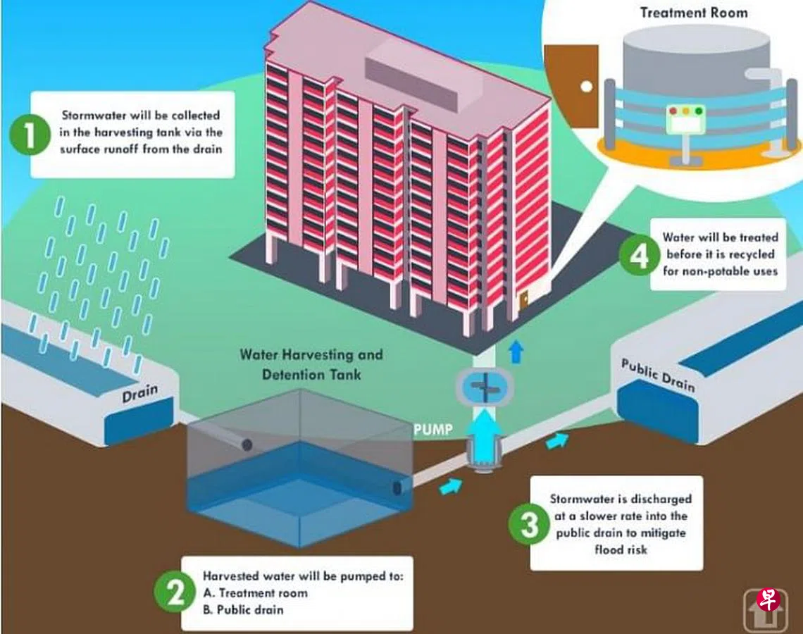 建屋局指出,在新预购组屋项目中,当局可以提前规划和设计集水系统的基础设施,以确保系统的位置可以是在排水管道收集最多雨水的地方。不过,这是在现有组屋区无法做到的。