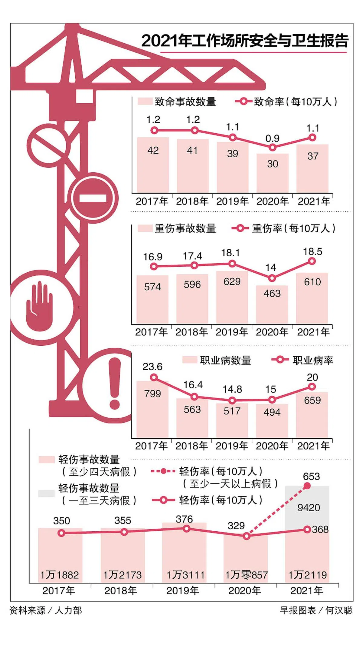 2020年因疫情影响导致一些工程停工和多数人居家工作,工伤事故的致命率、轻重伤、职业病数量全面下滑,但随着越来越多人返回工作场所,数据逐渐反弹,工伤事故在去年上半年夺走23条人命,下半年也有14人丧生。