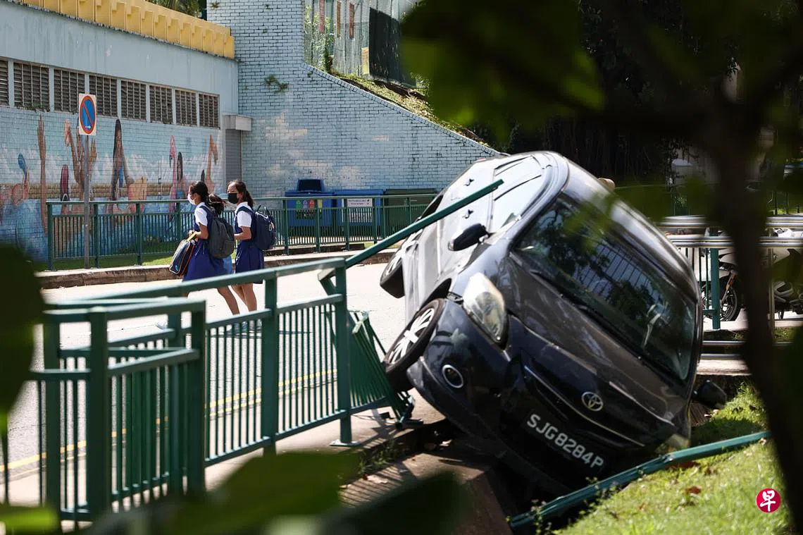 根据读者提供的照片,一辆深蓝色汽车疑在发生交通事故后失控,车子冲向路旁的行人道,撞破围栏,左边车身卡在行人道和沟渠之间。路旁的围栏被撞得东歪西倒,其中一部分更被撞落到草坪上,车子的速度和撞击力可见一斑,所幸事发时人行道上没人走动,否则后果不堪设想。