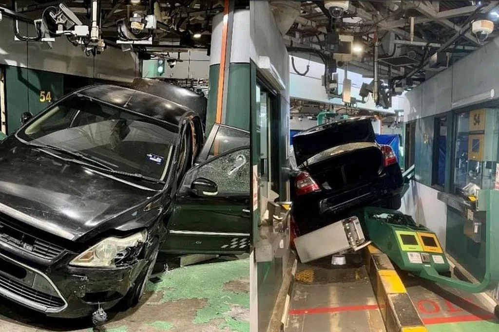 根据在社交媒体上流传的照片,一辆黑色轿车的车尾翘起,相信是在撞毁通关闸门及绿色的生物认证自动通关系统(BIKES)后,卡在两条狭窄的电单车道之间无法动弹。