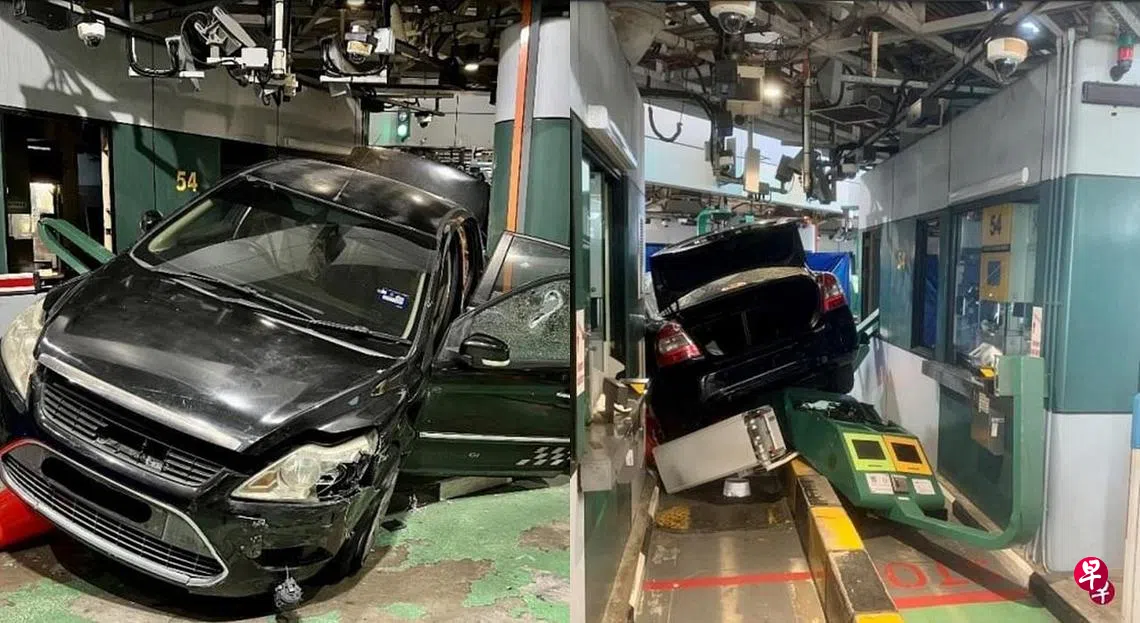 根据现场照片所见,车子相信是在撞毁通关闸门及绿色的生物认证自动通关系统(BIKES)后,卡在两条狭窄的电单车道之间无法动弹。