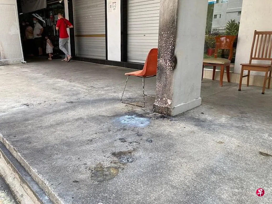 根据网上流传的照片,一辆个人代步工具(PMD)在店屋外走廊烧成废铁,还在冒烟,附近墙面和地面都被熏黑,至少八名公众则站在一段距离外围观。