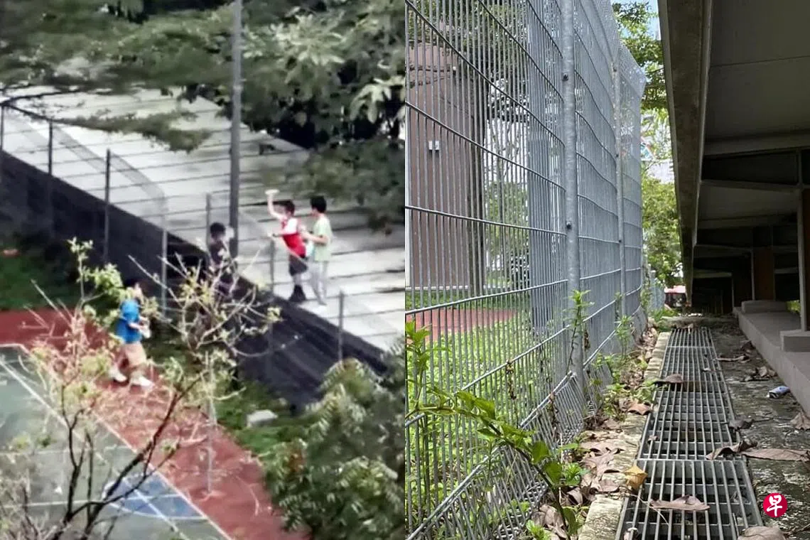 根据该居民拍摄的视频,两名小孩站在有盖走道顶端,另一名小孩站在走道的柱子旁,还有一名小孩站在围栏外的地上,几个人隔着围栏互相丢水瓶,还有人在吃东西。