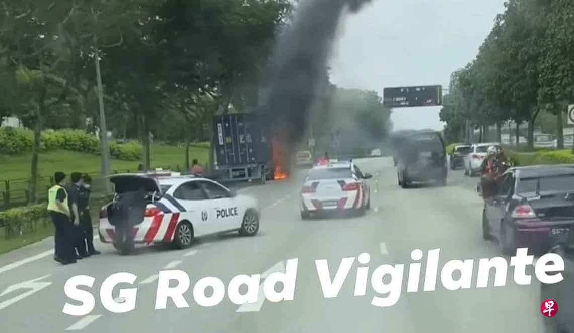 据网络流传的视频,起火狂烧的集装箱拖车,当时停在最左的车道上,车头被火舌吞噬,浓烟直冒。不远处,三辆警车停在路旁提供支援,经过的车辆也纷纷减速行驶。
