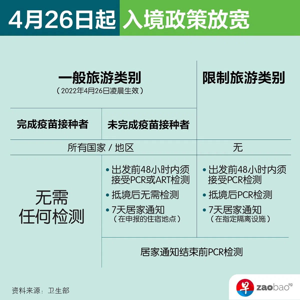 新调整将从下周二(26日)零时01分起生效,所有完成接种、且健康良好的旅客入境新加坡前后,不再须要接受冠病检测或隔离。