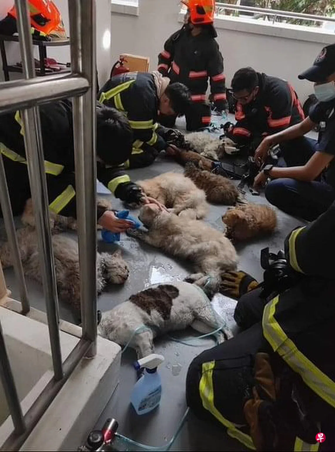 新加坡民防部队回复zaobao.sg的询问时说,昨天早上8时30分左右接获通报后,立刻派拯救人员赶往现场。消防员到场后强行进入单位,用三个压缩空气泡沫背包灭火。消防员也在失火单位内,发现14只受困的猫咪已经失去意识,躺在里面。