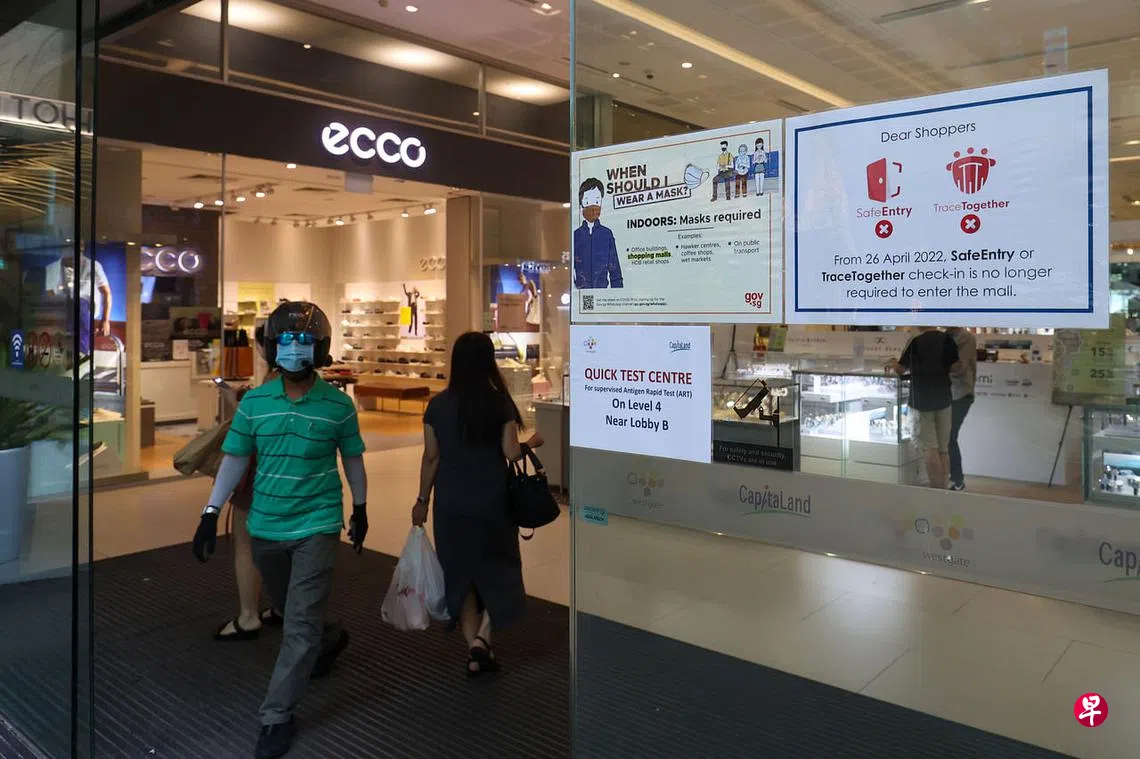 《联合早报》记者今天上午约11时走访裕廊东一带的购物商场,所有商场入口的栏杆都已撤除,不再有SafeEntry工作人员在入口处检查访客是否已完成登记。一些商场也在门口贴上告示,提醒公众不必使用合力追踪(TraceTogether)应用或便携器登记,同时在商场内也要戴好口罩。
