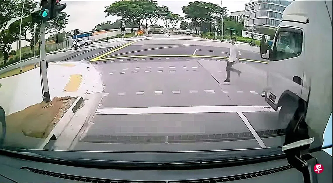 当时拍下视频的车辆行驶在最左边车道,而中间车道则有一辆之前停在那边等待交通灯转绿灯的货车。相信货车司机看到男子闯过马路只好继续停下。