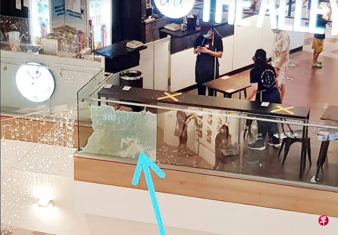 (早报讯)淡滨尼一间商场二楼的玻璃围栏突然爆破,结果下起“玻璃雨”,碎片掉落到楼下咖啡座,食客慌逃。