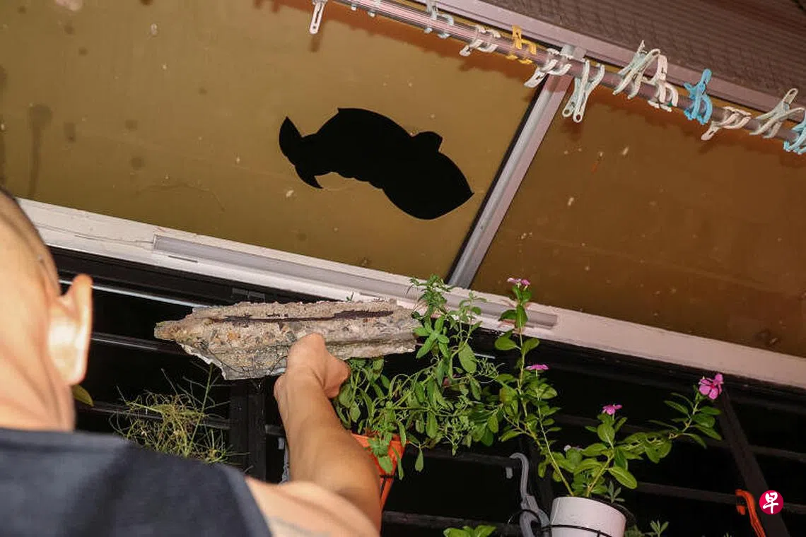 这起事件发生在星期一(5月16日)下午5时左右,地点是后港10道第455座组屋的一个双层公寓单位。侯姓屋主(43岁,经理)说,当时天正下着大雨,突然间听到阳台传来一声巨响。他到阳台一看,赫然发现一个混凝土块砸穿了塑料顶棚,塑料碎片和盆栽的泥土洒了一地。