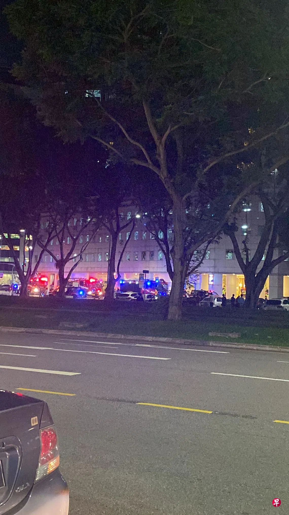 根据读者提供的照片,大厦前的路旁停放着数辆消防车,民防人员接获通报后抵达现场救援。