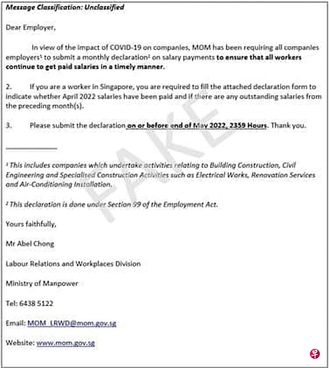 若收件人是员工,电邮同样要求对方提交申报单,以说明是否已收到今年4月份的薪资,或雇主是否有拖欠薪资。