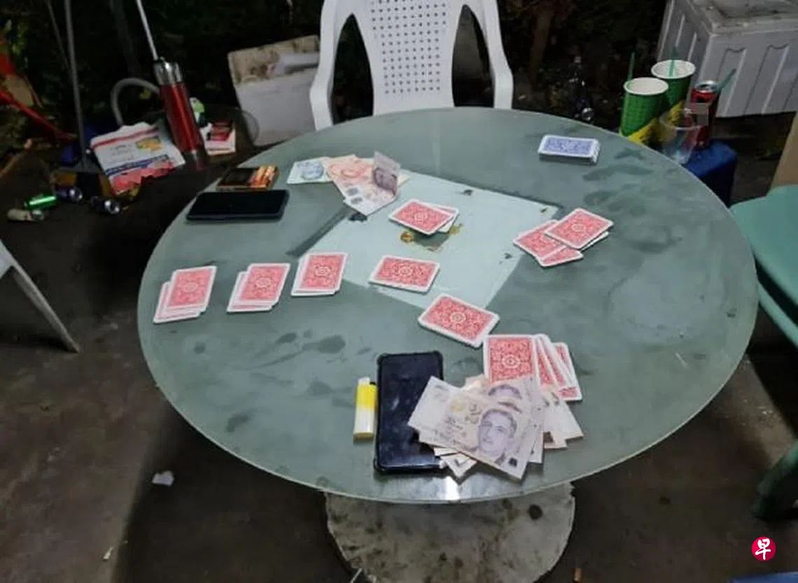 在第二次行动中,八名年龄介于55岁至76岁的男子,以及一名68岁女子,则因在樟宜路涉及非法赌博活动被捕。现场搜出258元现金,一台手机和赌博用具。