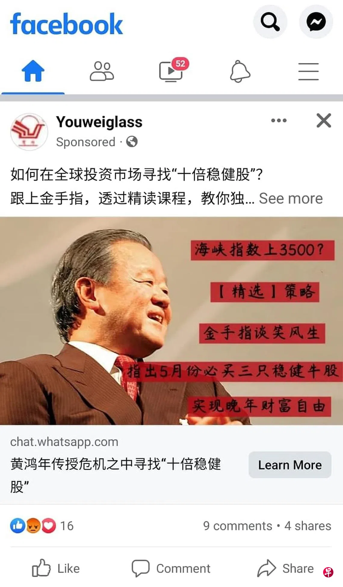 有读者向《联合早报》通报,社交媒体面簿正广传黄鸿年“带领新加坡投资者捕捉三只价值股票”的宣传,并邀请网民加入WhatsApp群组。