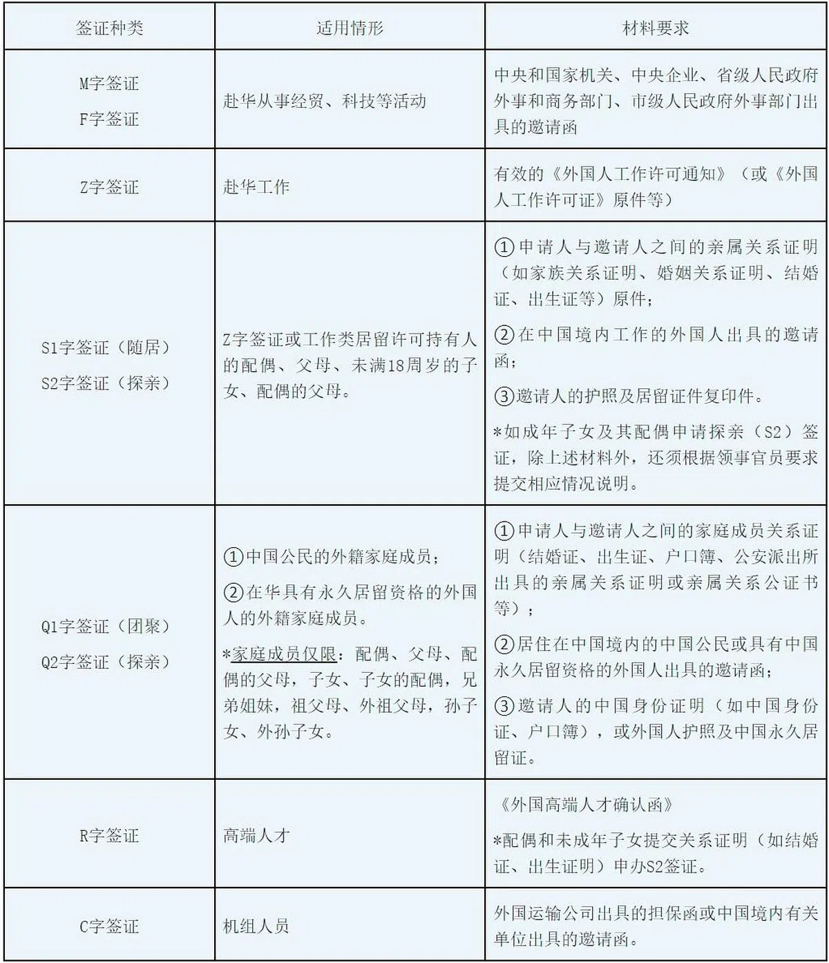 除了赴华从事经贸科技等活动的M字和F字签证、赴华工作的Z字签证、高端人才的R字签证、机组人员的C字签证,通知列出的签证种类及申请材料要求还包括中国公民的外籍家庭成员或在华具有永久居留资格的外国人的外籍家庭成员可申请的Q1字(团聚)签证和Q2字(探亲)签证,以及Z字签证或工作类居留许可持有人的配偶、父母、未满18周岁的子女、配偶的父母可申请的S1字(随居)签证、S2字(探亲)签证。