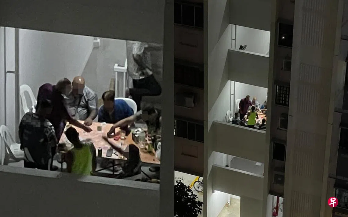 (早报讯)居民申诉,一群阿叔深夜在组屋楼梯间摆桌开赌,还吸烟、喝酒,扰人清梦。