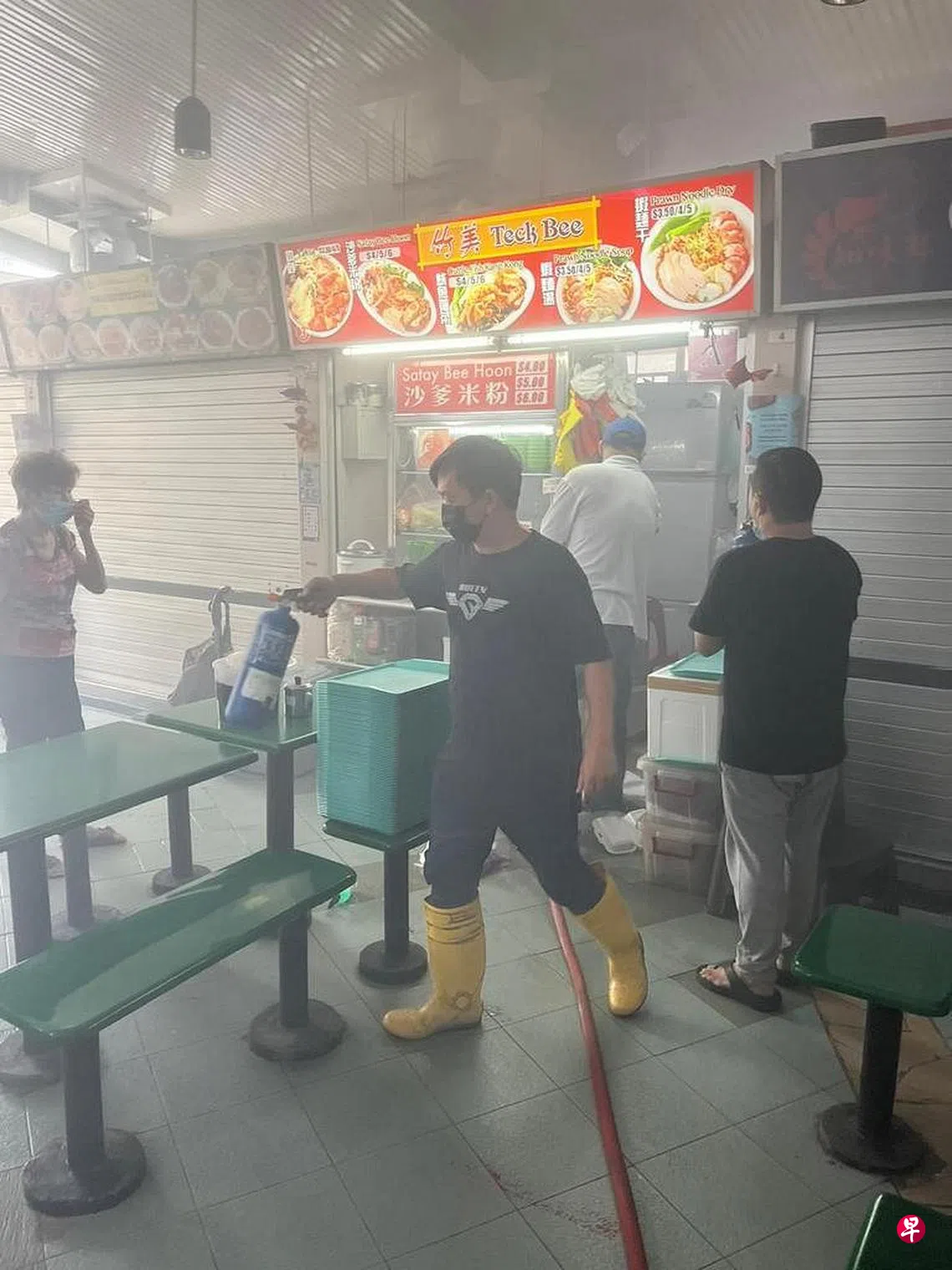根据受访者提供的照片,熟食中心事发后白烟弥漫,不少食客相信无法忍受烧焦味而纷纷离开。一名白衣男子则拉起消防水管,往厨房持续灌水。