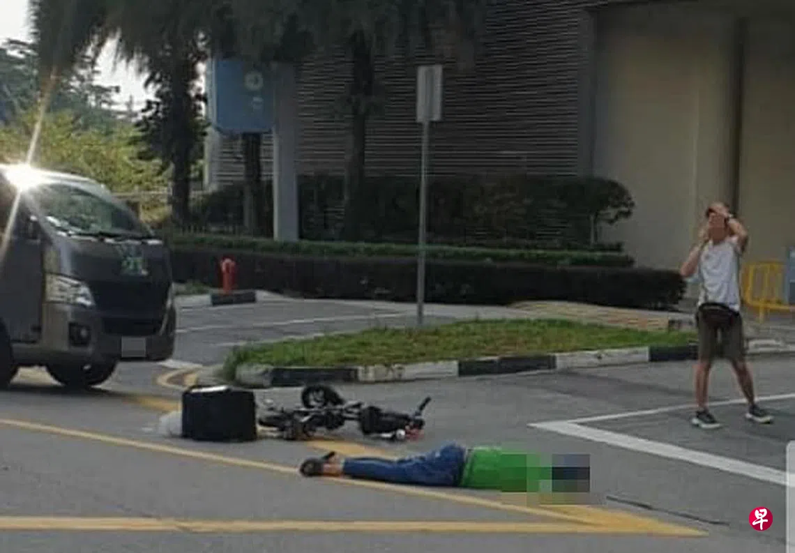 根据社交媒体流传的视频和照片,一名身穿青色Grab制服的送餐员面部朝下倒卧在地,头部鲜血直流。事发后,有不少送餐员站在一旁协助疏导交通,医护人员也在现场救治伤者。