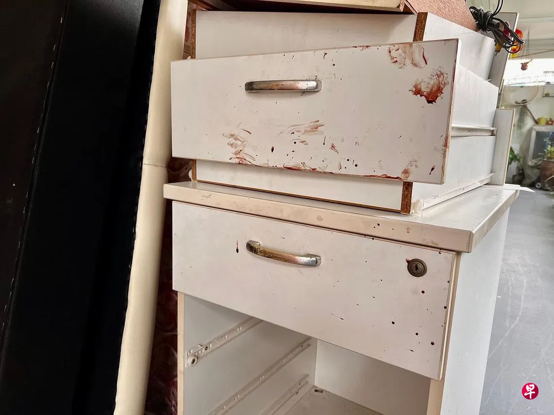 《联合早报》记者星期六(6月25日)下午3时左右走访案发单位,一名搬运工人正从屋内搬出大批物品,包括电风扇、床褥、衣橱与橱柜,其中橱柜可见斑斑血迹。