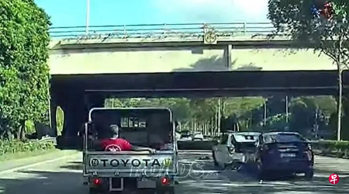 网络流传的视频显示,事发时一辆白色汽车突然停在靠近亚当路(Adam Road)出口的快速公路上,结果遭后方德士撞上,后行李厢的厢盖也弹开。
