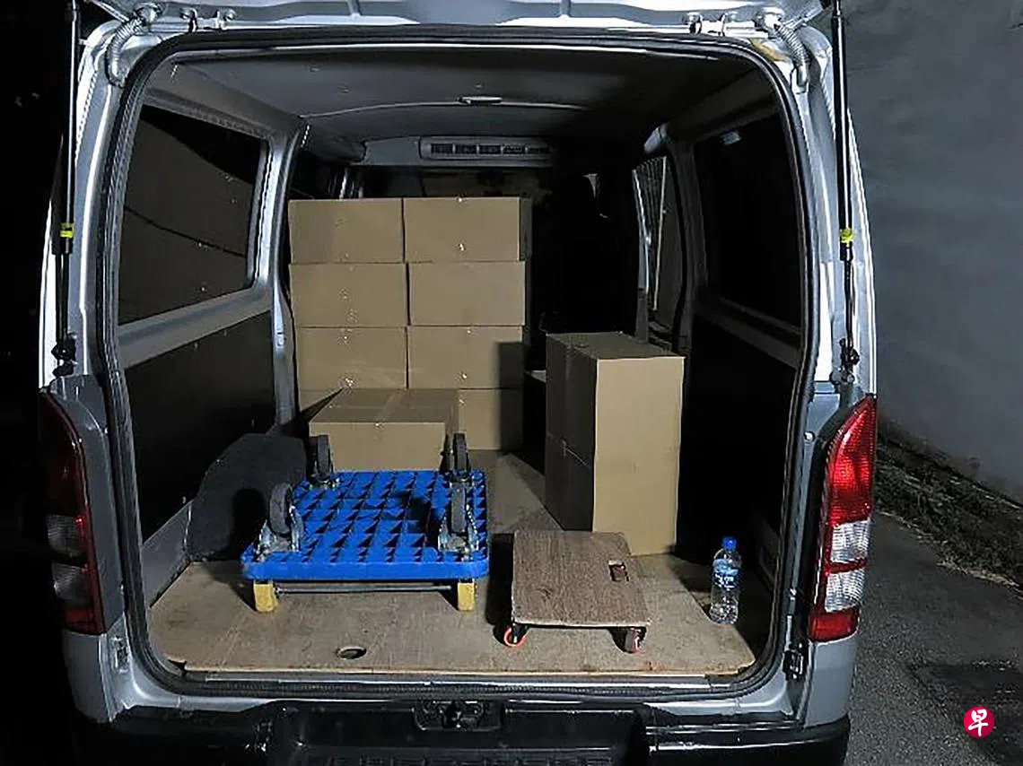 新加坡关税局星期四(6月30日)发文告说,关税局人员于本月28日在花林荫园(Waringin Park)附近展开执法行动时,发现有褐色箱子从一辆本地注册的货车,转移至停放在旁边的另一辆汽车。