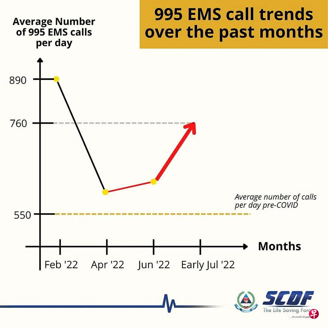 (早报讯)自2022年4月以来,民防部队接获的紧急医药服务(Emergency Medical Services,简称EMS)电话数量出现攀升趋势,本月第一周平均每天接获760通紧急电话,最高峰则是一天810通。