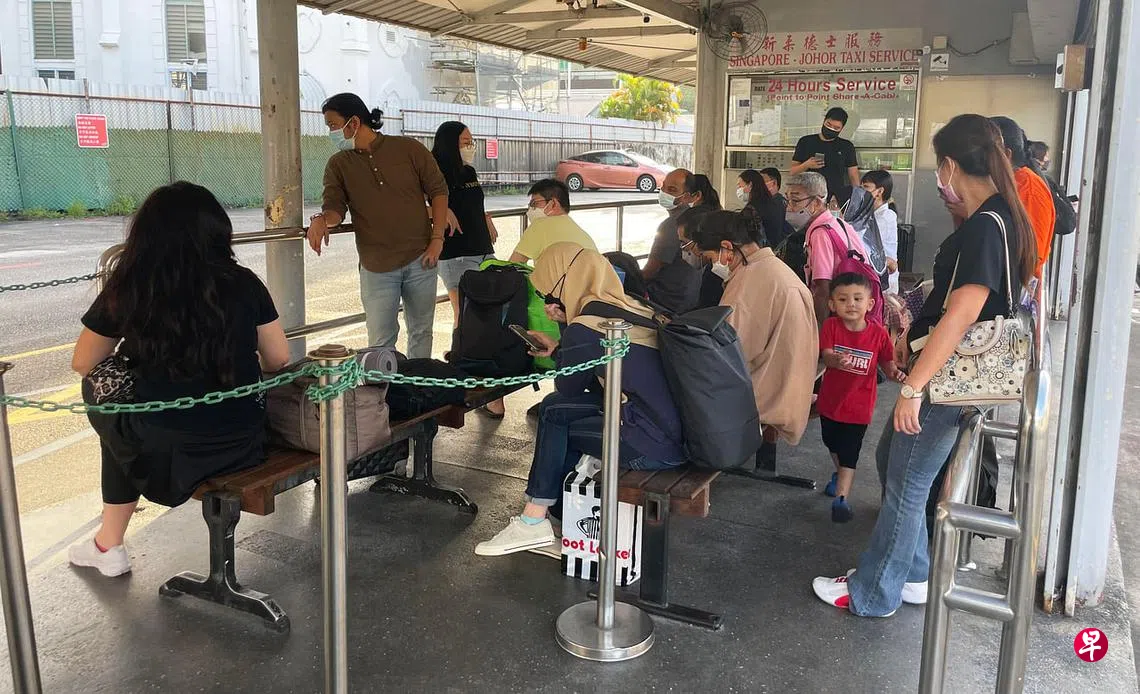 (早报讯)哈芝节长周末,因关卡堵车严重,有新柔跨境德士司机索性暂不提供跨境服务,万山街德士站星期五(7月8日)现人龙。