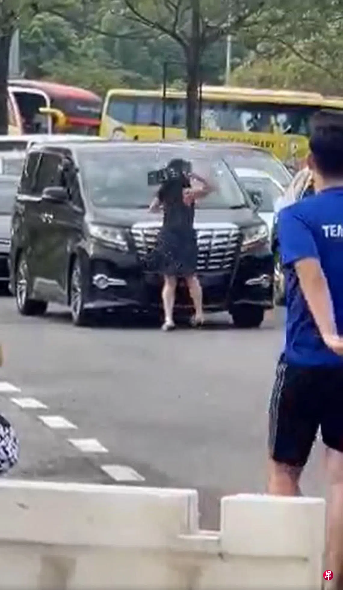 在另一段由第三方拍摄的视频中,同一名女子挡在MPV的前方,后者尝试慢速前行时,她甚至转身背贴车头,尝试把车拦下。这段视频也可看出女子是一辆新加坡注册红色轿车上的乘客,就在女子砸车牌时,车上一名身穿蓝色初院体育汗衫的年轻男驾驶员,也一度下车对着MPV大比中指。