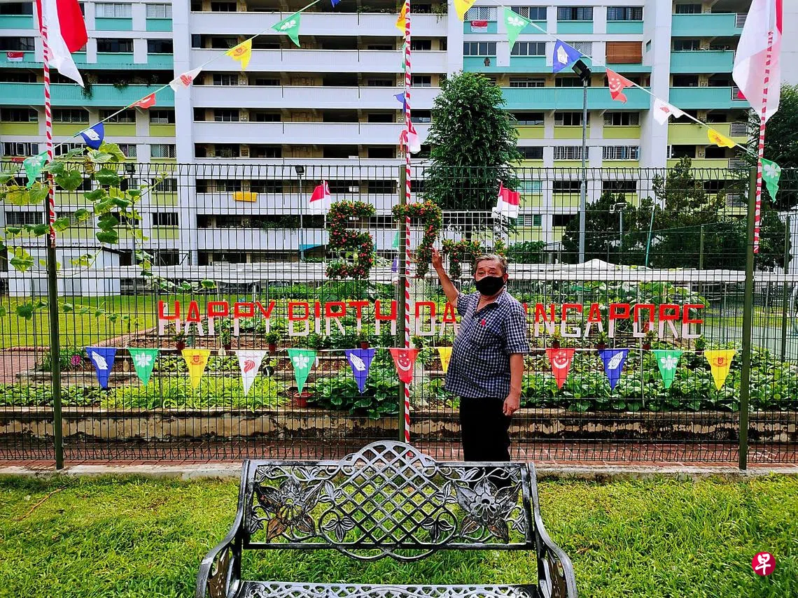 去年国庆日只用纸皮做装饰,今年则选择用真花,他解释是因为期待见到朋友们看见时的惊喜。“新加坡一年一次的生日,希望给大家带来欢乐。”
