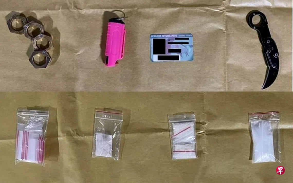 (早报讯)肃毒局在执法行动中缉获市价4万7000元毒品,30岁男子涉嫌贩毒、使用胡椒喷雾攻击执法人员,当场被逮捕。当局人员过后也从男子身上搜出指节铜套、爪刀等武器。