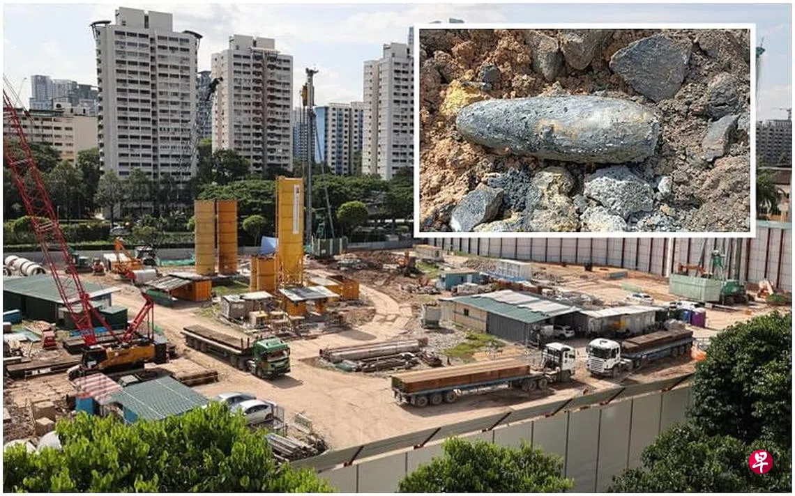 预购组屋工地挖出疑似二战炸弹,工人停工疏散,警方封锁工地和附近行人天桥。