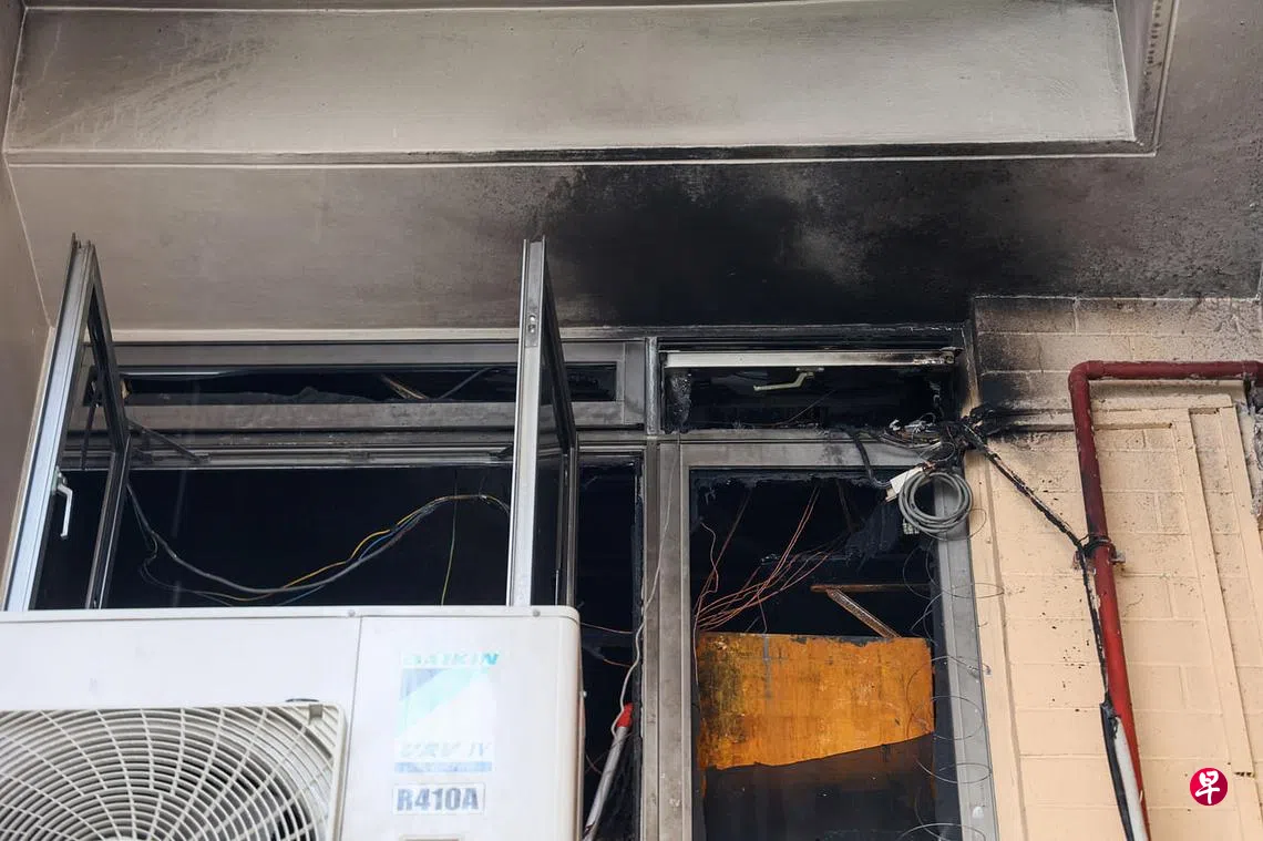 记者走访现场时,失火单位侧门的楼梯间拉起了红色胶条,地面残留一些灰烬,二楼组屋外墙明显被熏黑。除此之外,单位的玻璃窗和电缆也因抵挡不住高温,分别爆裂和松脱。
