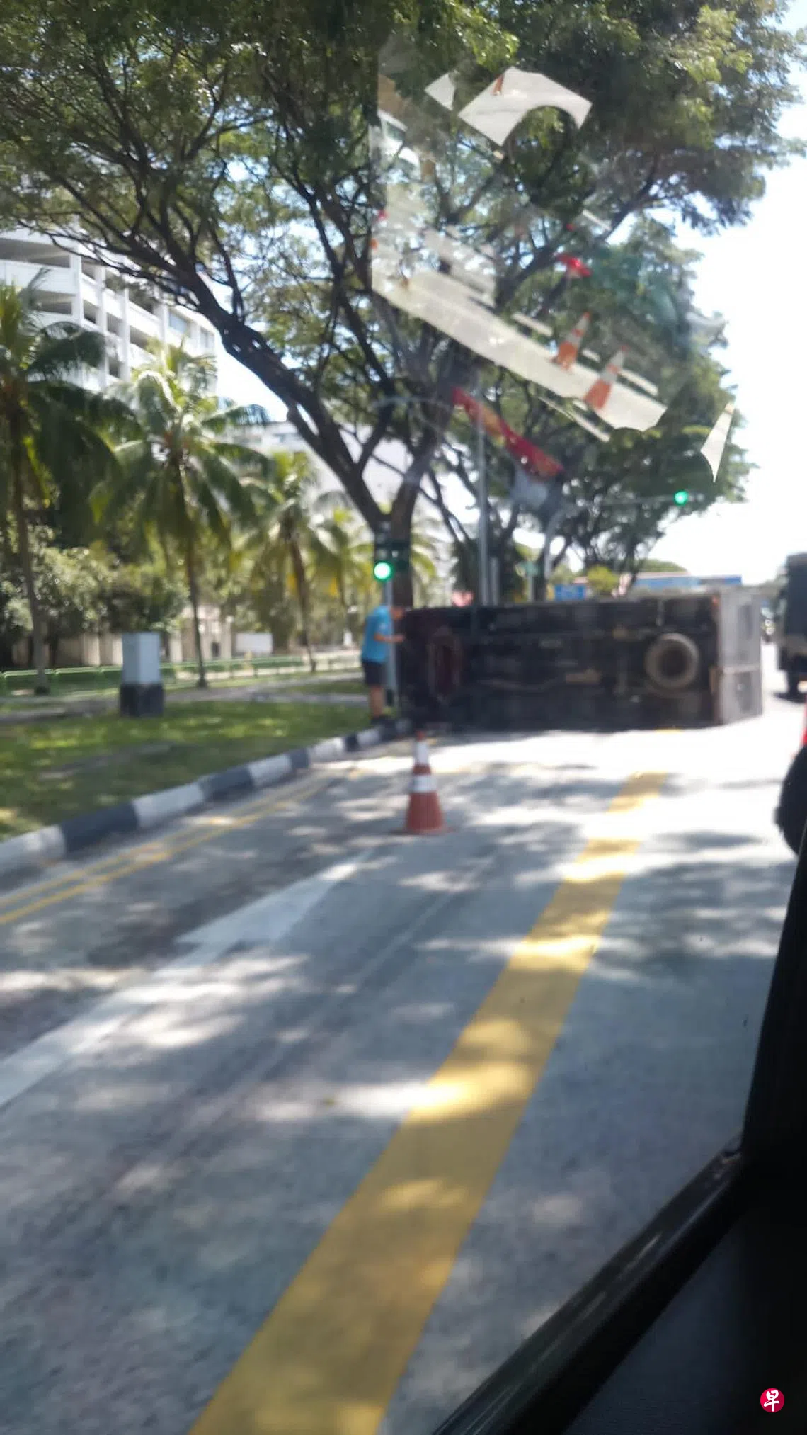 根据《联合早报》读者提供的视频,一辆货车翻覆,横亘在惹兰友诺士的车道上。