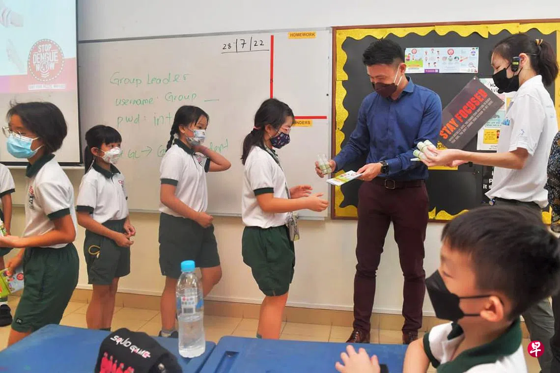 交通部兼永续发展与环境部高级政务次长马炎庆星期四上午走访培童小学,向学生派发防蚊液和传单。