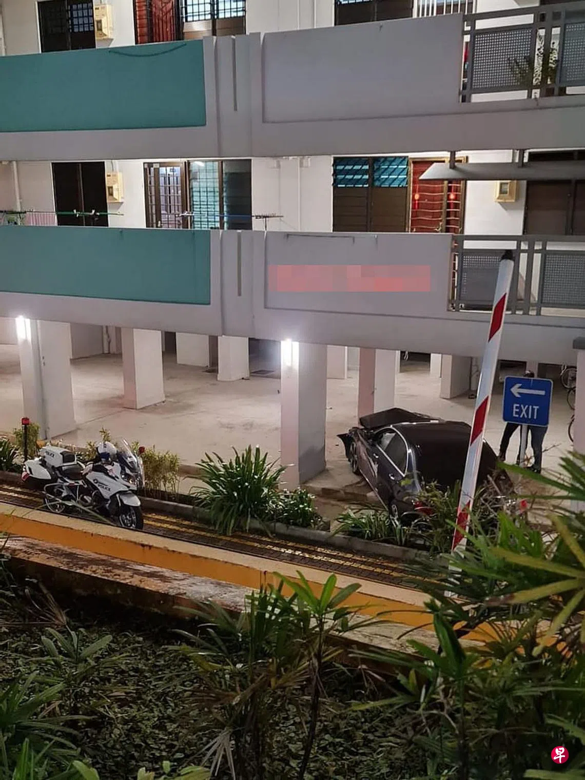 根据面簿专页District Singapore的帖文,一辆黑色马赛地轿车撞上组屋底层的柱子。轿车的车头撞柱,车尾则撞上旁边的石阶,引擎盖凹陷,防撞杠也脱落,损坏严重。现场还看到一辆警车停在路边,两个人正在交谈。