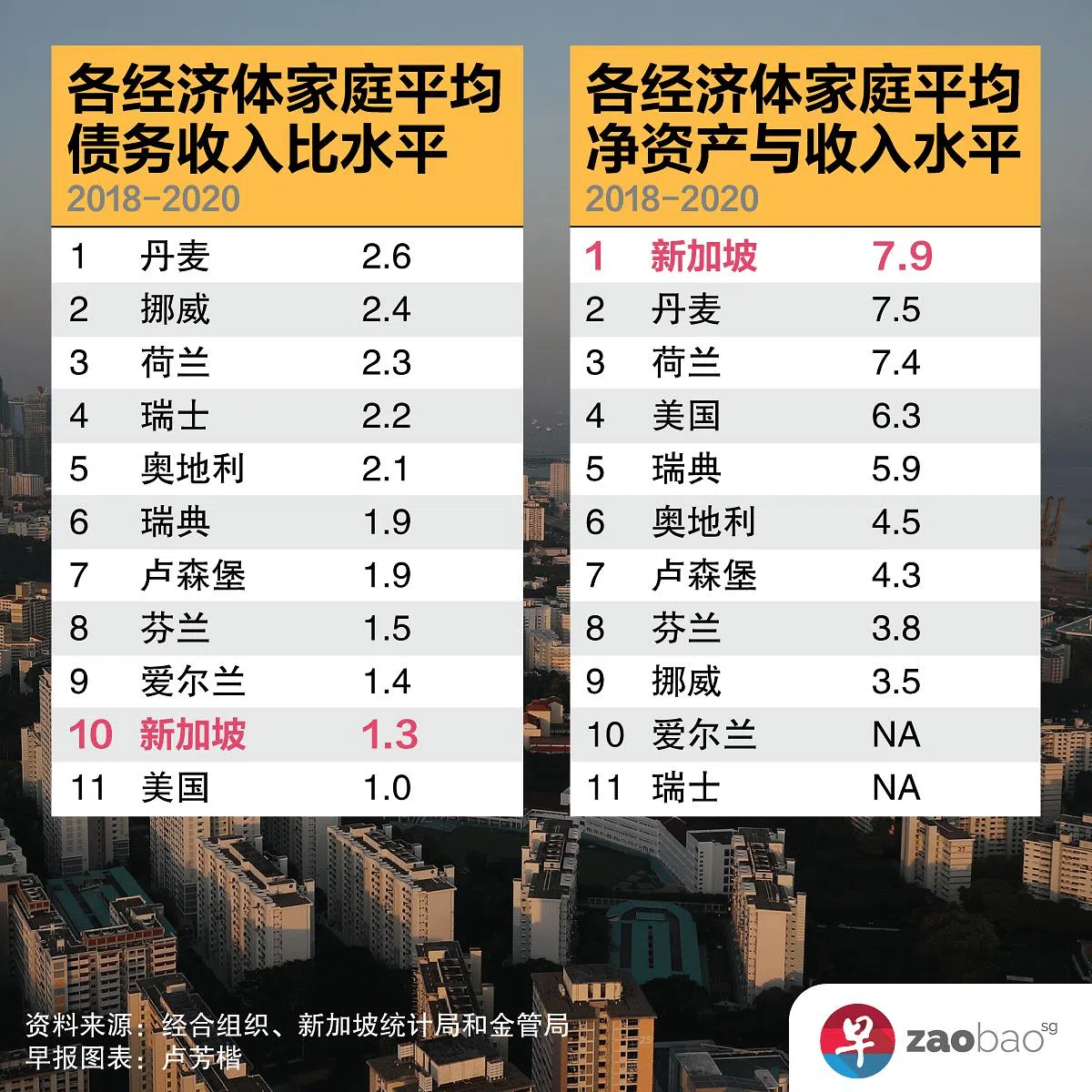 从数据来看,2018至2020年期间,新加坡家庭平均债务收入比(debt-to-income ratio)为1.3,与人均GDP最高的十大经济体相比,新加坡排名靠后,仅略高于美国。同时,新加坡家庭的资产总体上明显大于债务,2018至2020年的平均净资产与收入比(net assets-to-income ratio)为7.9,领先于人均GDP排名前十的经济体。