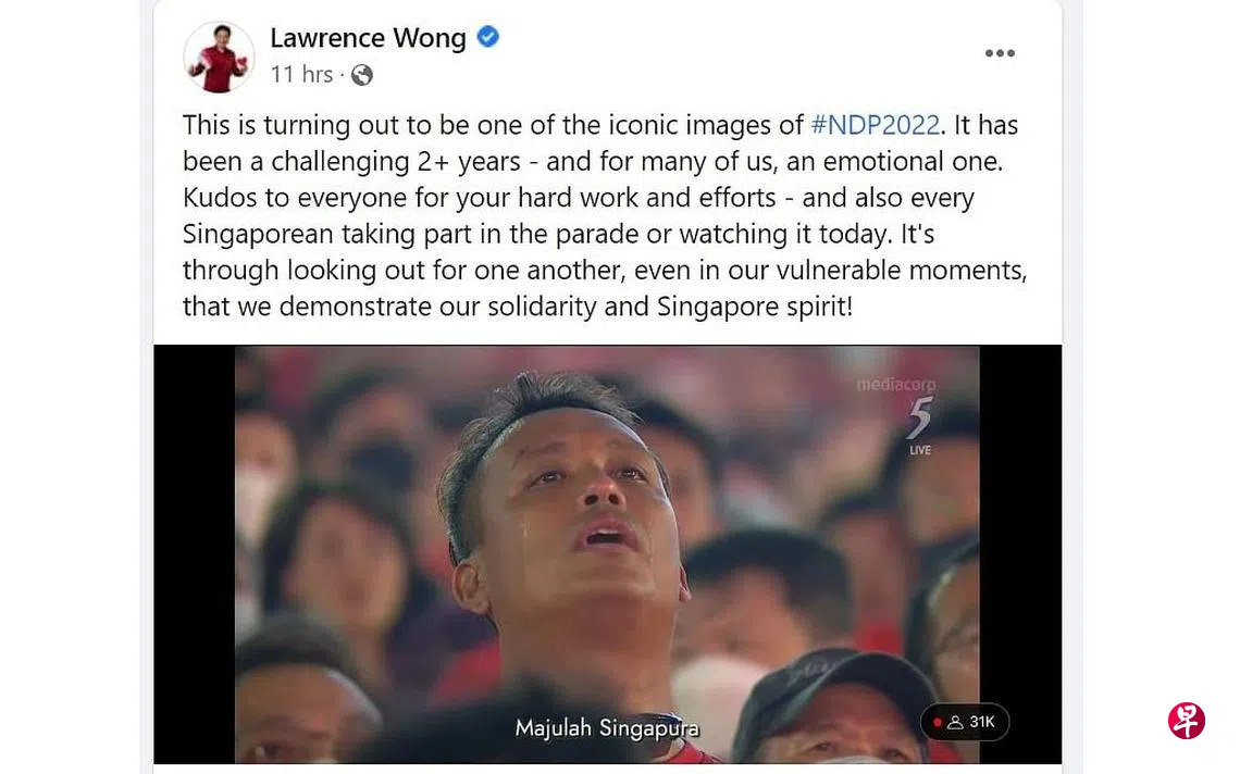 副总理兼财政部长黄循财也在面簿转发阿祖安落泪一幕,称这已成为今年国庆庆典的标志性一幕。黄循财说,过去两年多极具挑战的抗疫,对于很多人来说都是情绪化的一段日子。他也向所有辛勤工作付出的人致敬,也向所有参与到国庆庆典及观看国庆庆典的人们致敬。