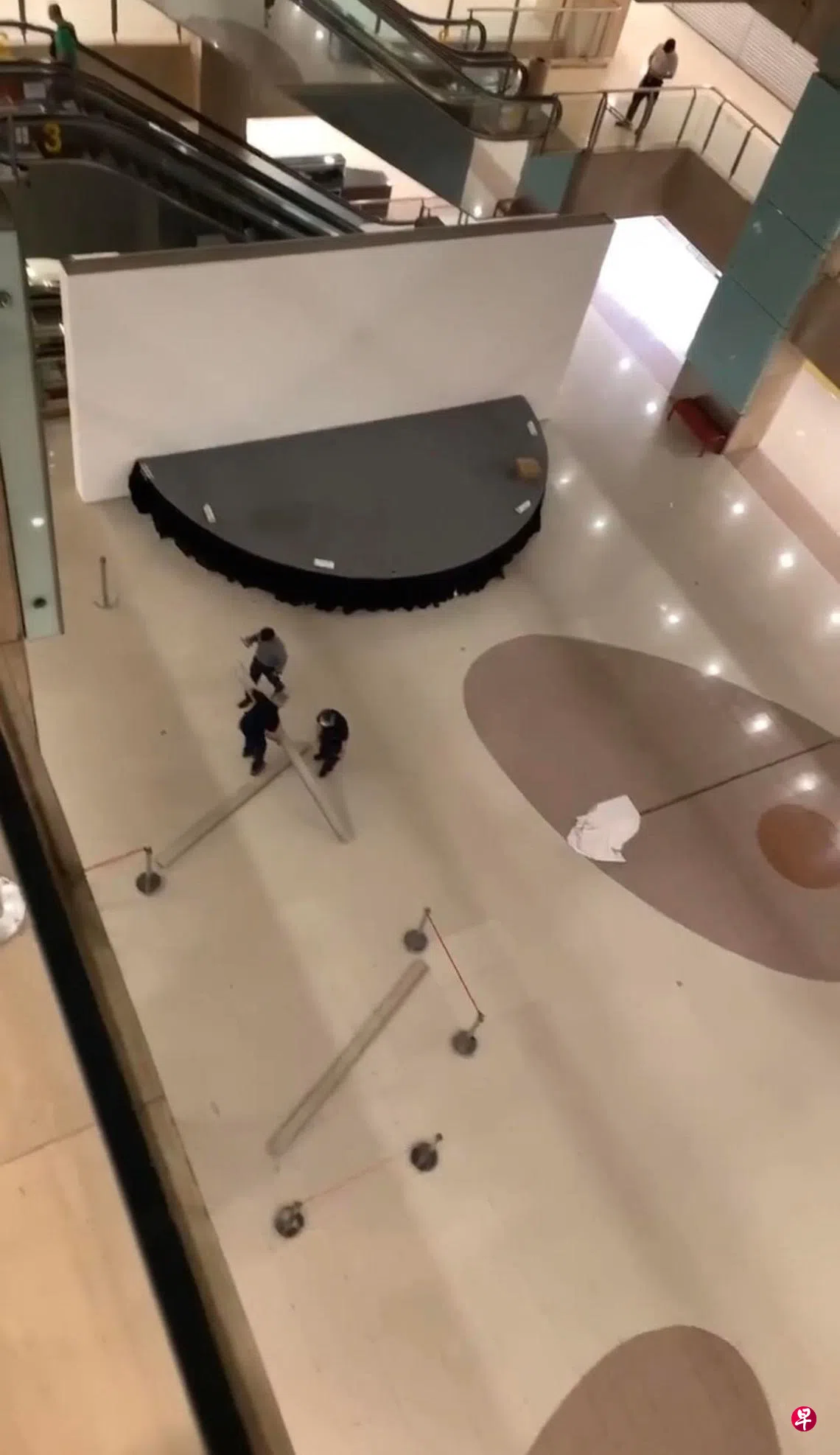 (早报讯)三块木板在商场“从天而降”,差点砸中一名女子,也有公众被吓得尖叫,工作人员赶紧清理现场并抬走木板。