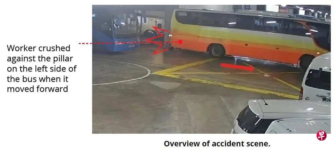 根据工作场所安全与卫生理事会星期三(8月10日)发表的文告,死者出事前站在停车场的墙柱旁,在巴士左侧指挥一辆巴士倒退停车。巴士驾驶员倒车后,试图驾驶巴士往前移动摆正位置,结果却在调整巴士位置时,意外把死者撞到墙柱上。