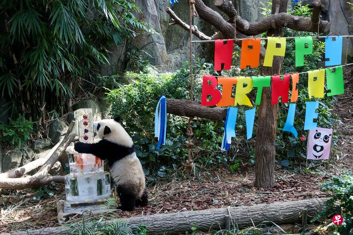 (早报讯)首只在本地出生的大熊猫叻叻将在星期天(8月14日)满周岁,河川生态园的工作人员星期五(8月12日)早上,以冰雕蛋糕提早为叻叻庆生。