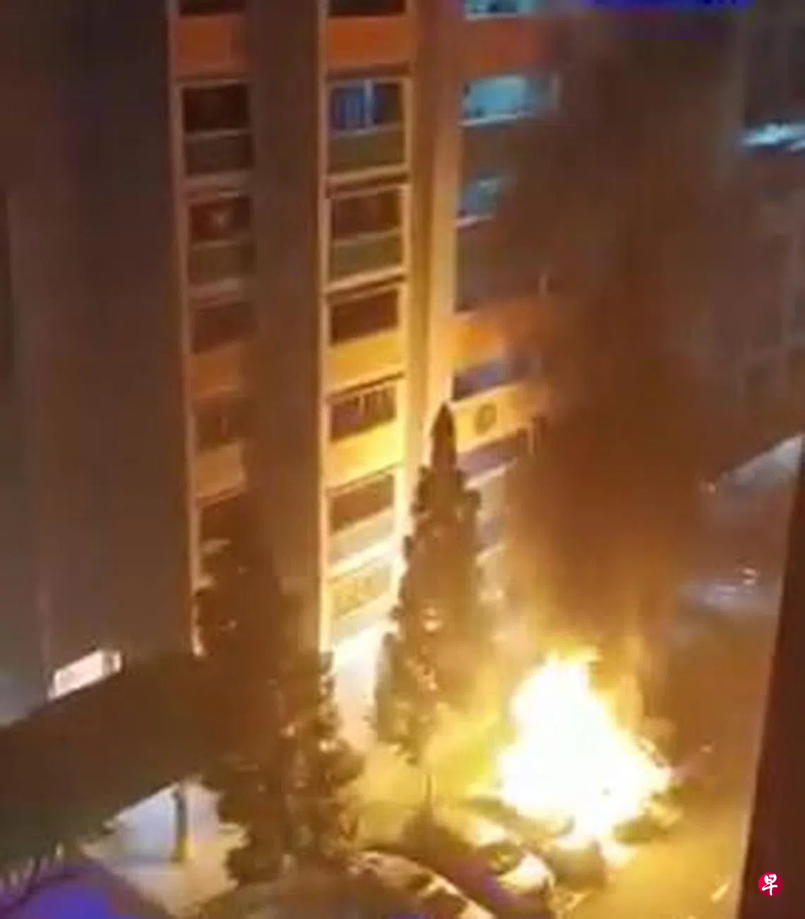 根据网上流传的视频,停放在露天停车场的一辆车子燃起熊熊烈火,火势殃及一旁的车辆。一名男子身体着火,挣扎地往组屋底层跑去。